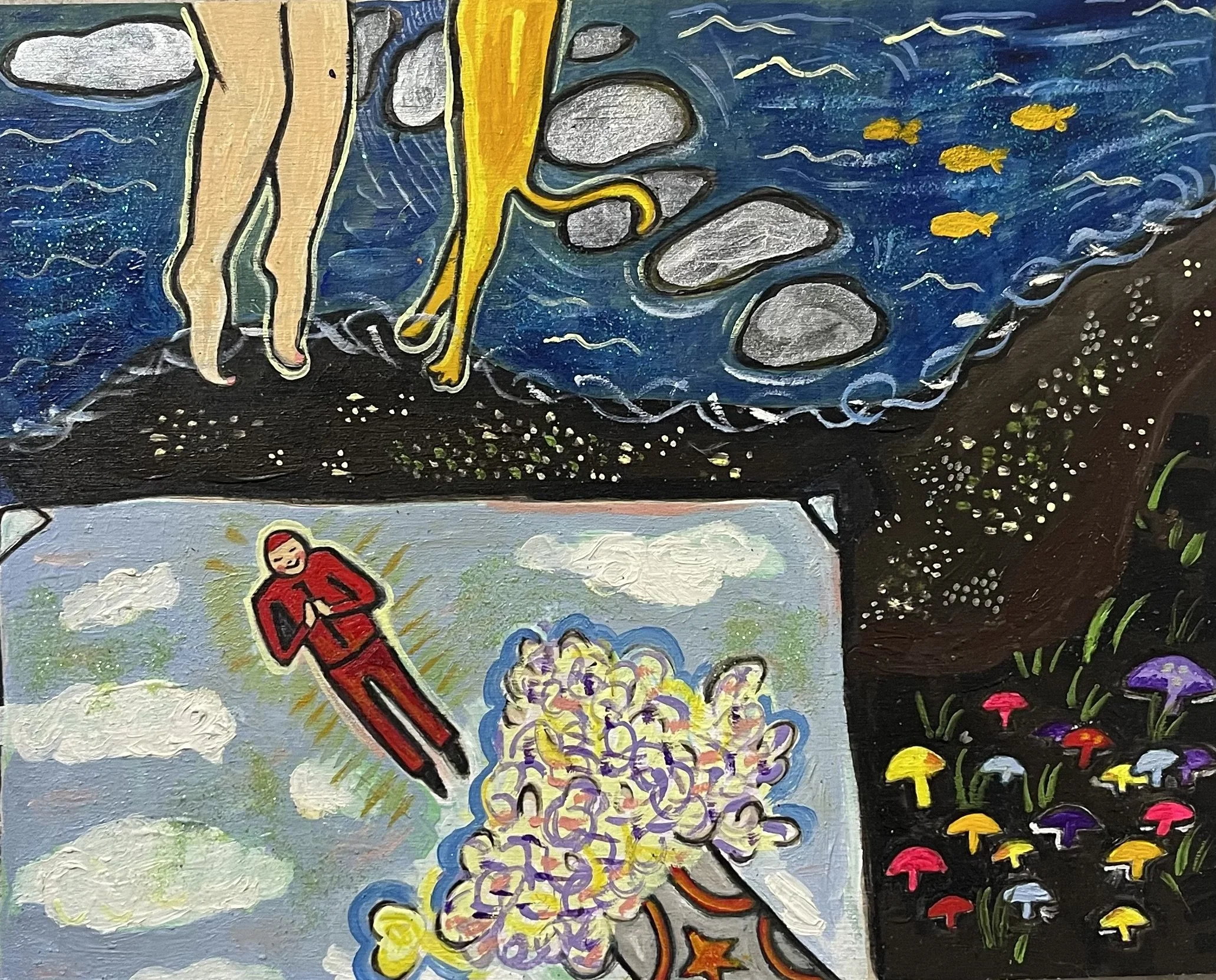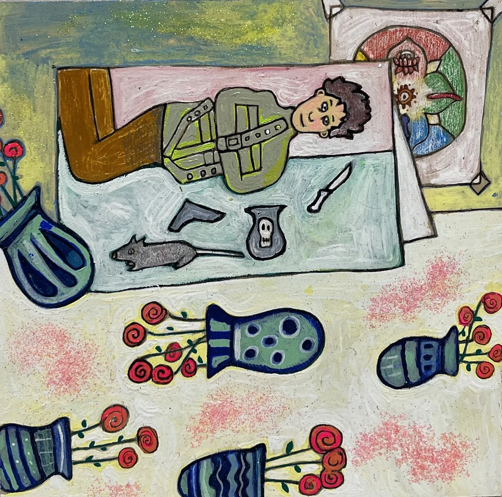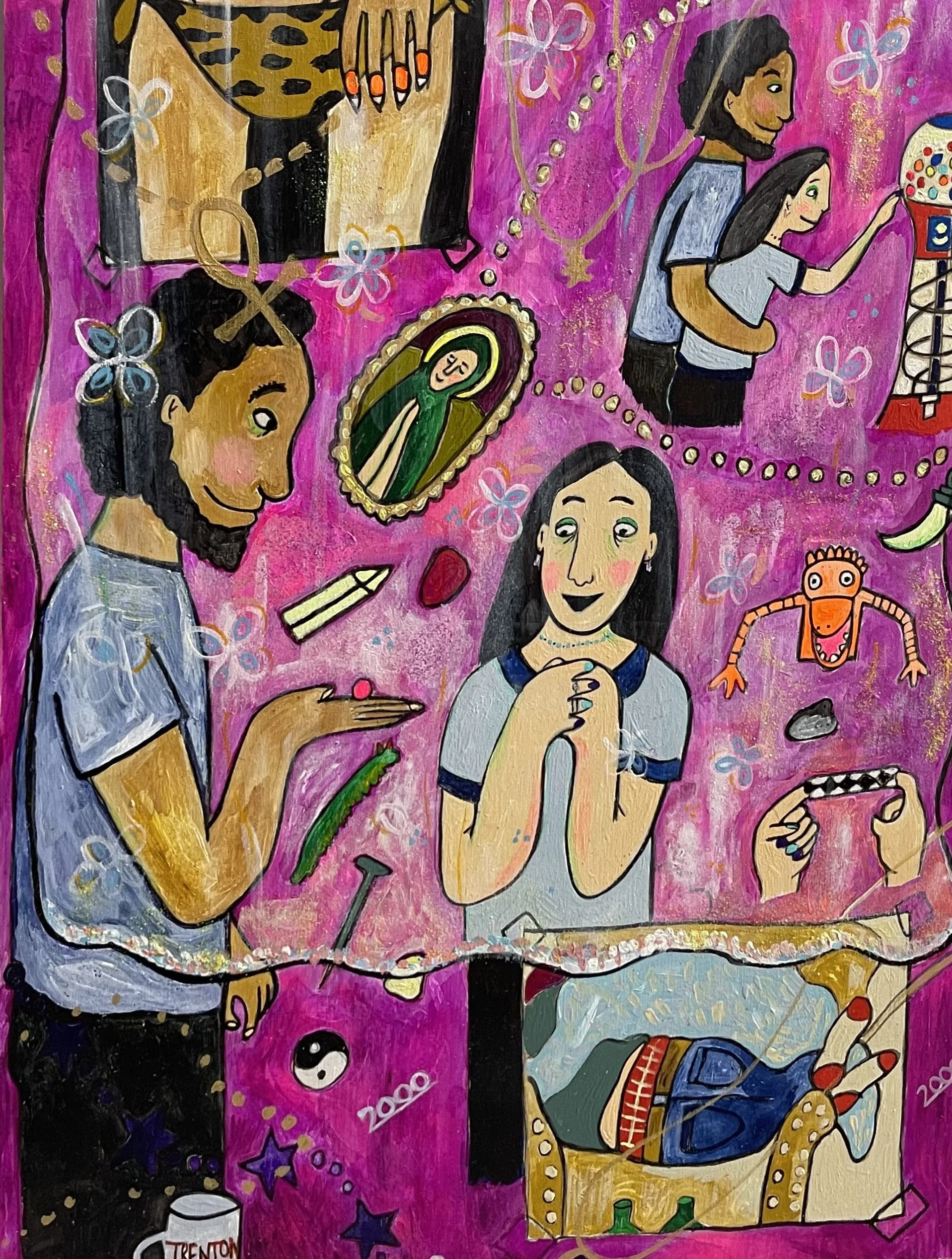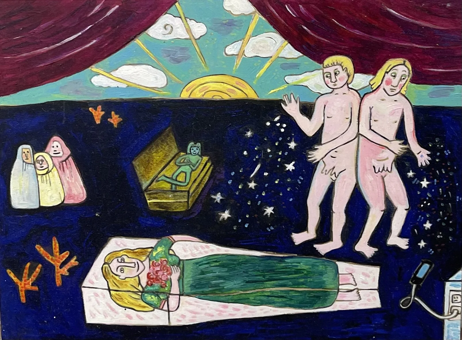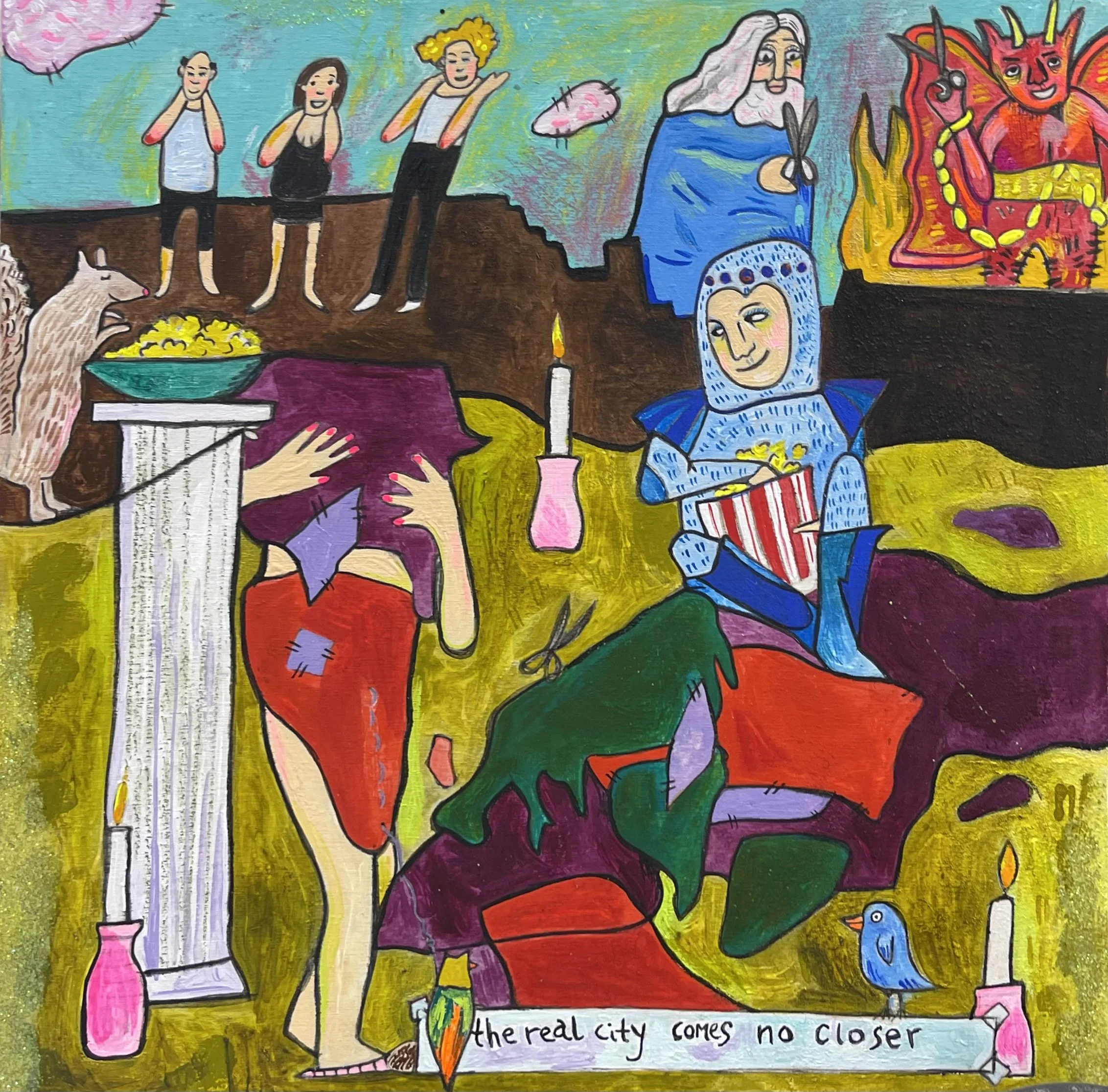 Buddhist teacher Dzongsar Khyentse Rinpoche has said that a knife becomes sharp as the result of "two exhaustions"--the exhaustion of the sharpening stone and the exhaustion of the metal. In the same way, he continues, "enlightenment is the result of the exhaustion of obscurations and the exhaustion of the antidote of obscurations." Liz Scheer sharpens the knife of her 'painting-poems' by rubbing together two disparate narratives (one visual and one verbal) that have respectively 'maxed out' their claims to reality. By pairing small jewel-toned paintings with patches of fiction pulled from a nonexistent ur-text, Scheer's work portrays the unexpected clarity that arises in moments of spiritual depletion. Through its uncanny iconography born from New Age paraphernalia and the culture of New England and the Midwest, Scheer's work portrays a kind of quotidian transcendence suffused with poignancy and humor.