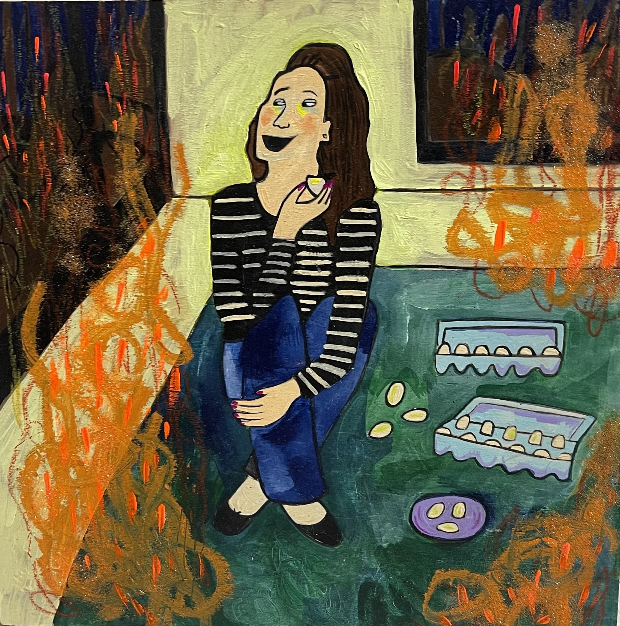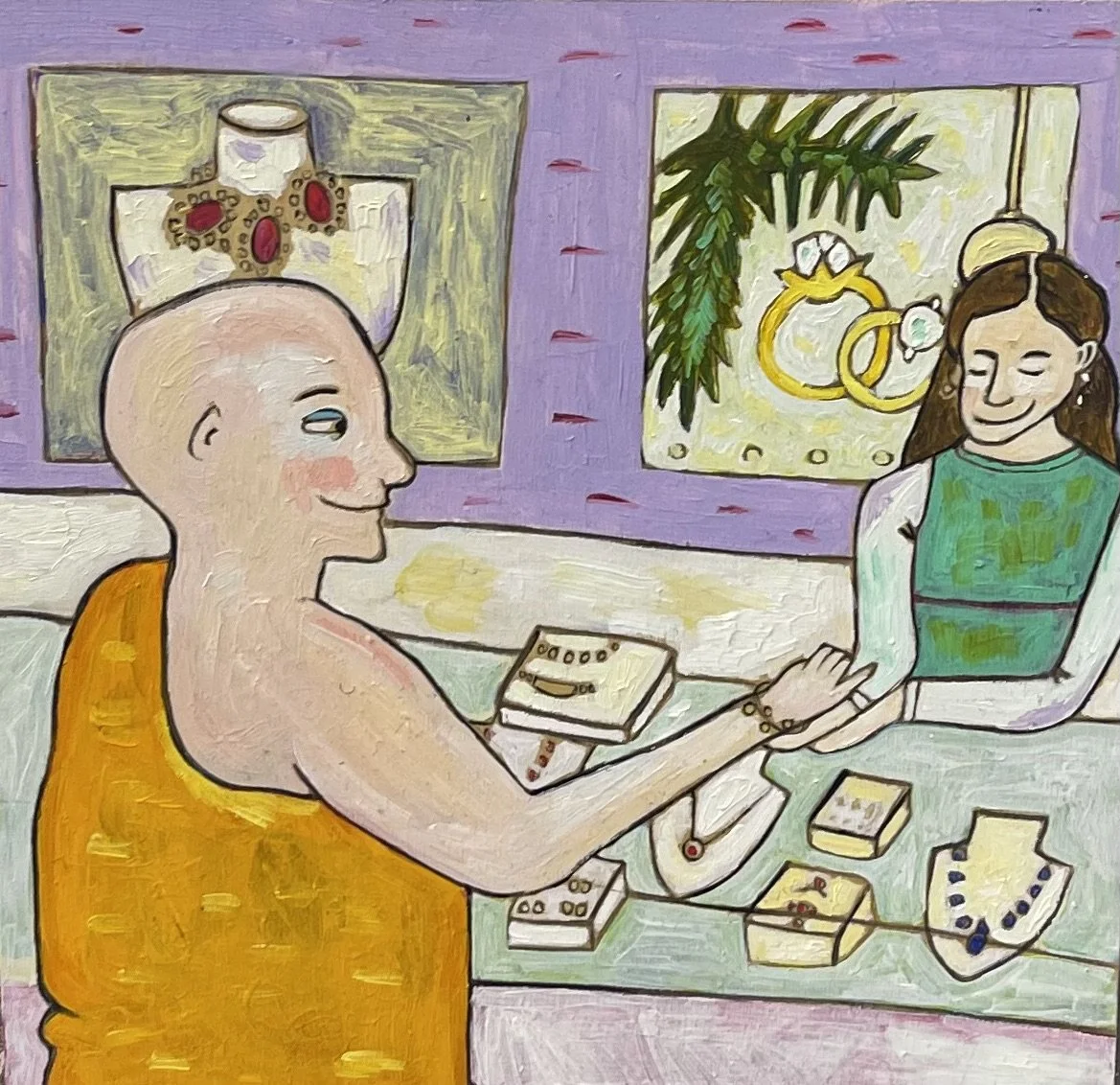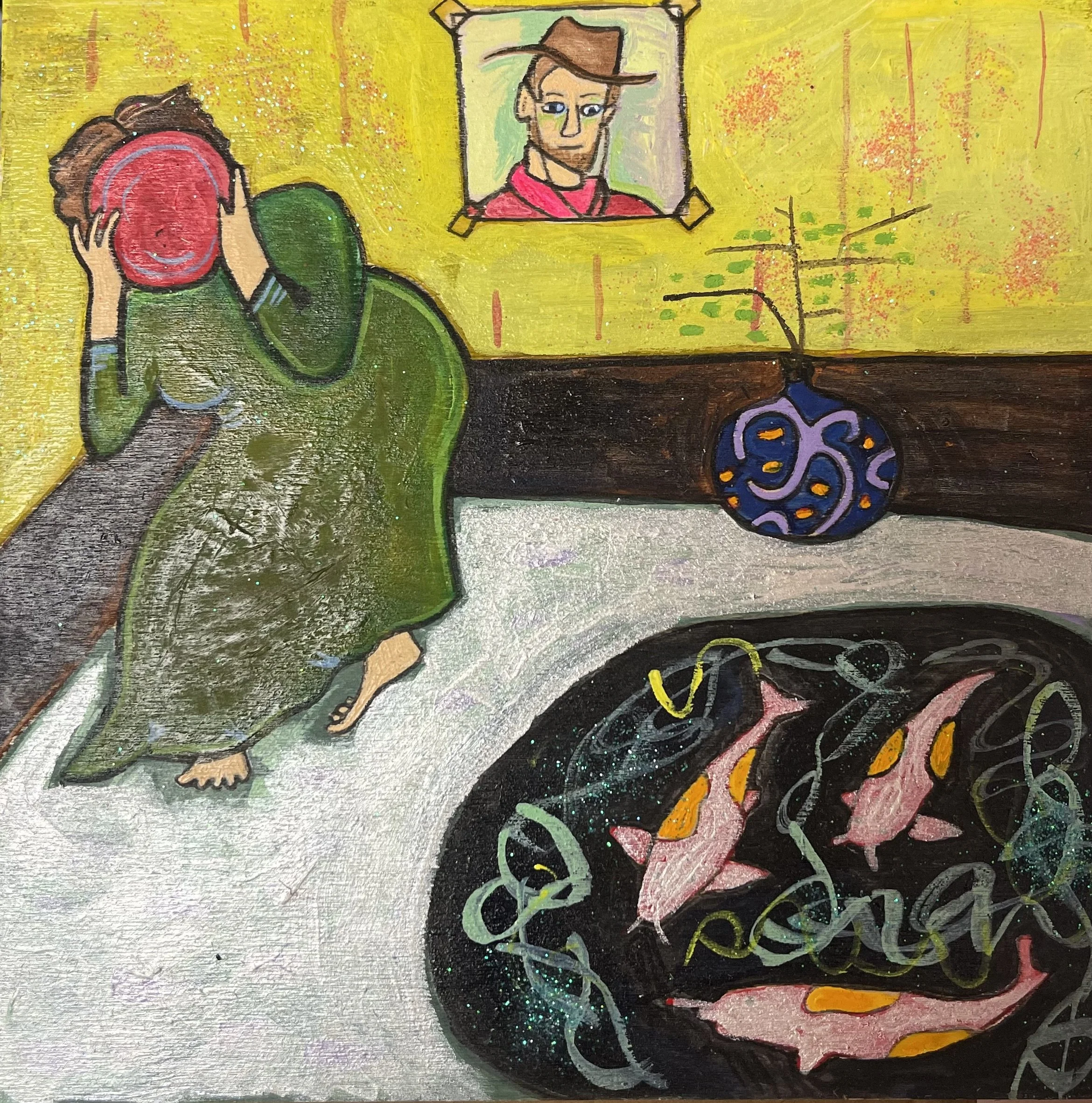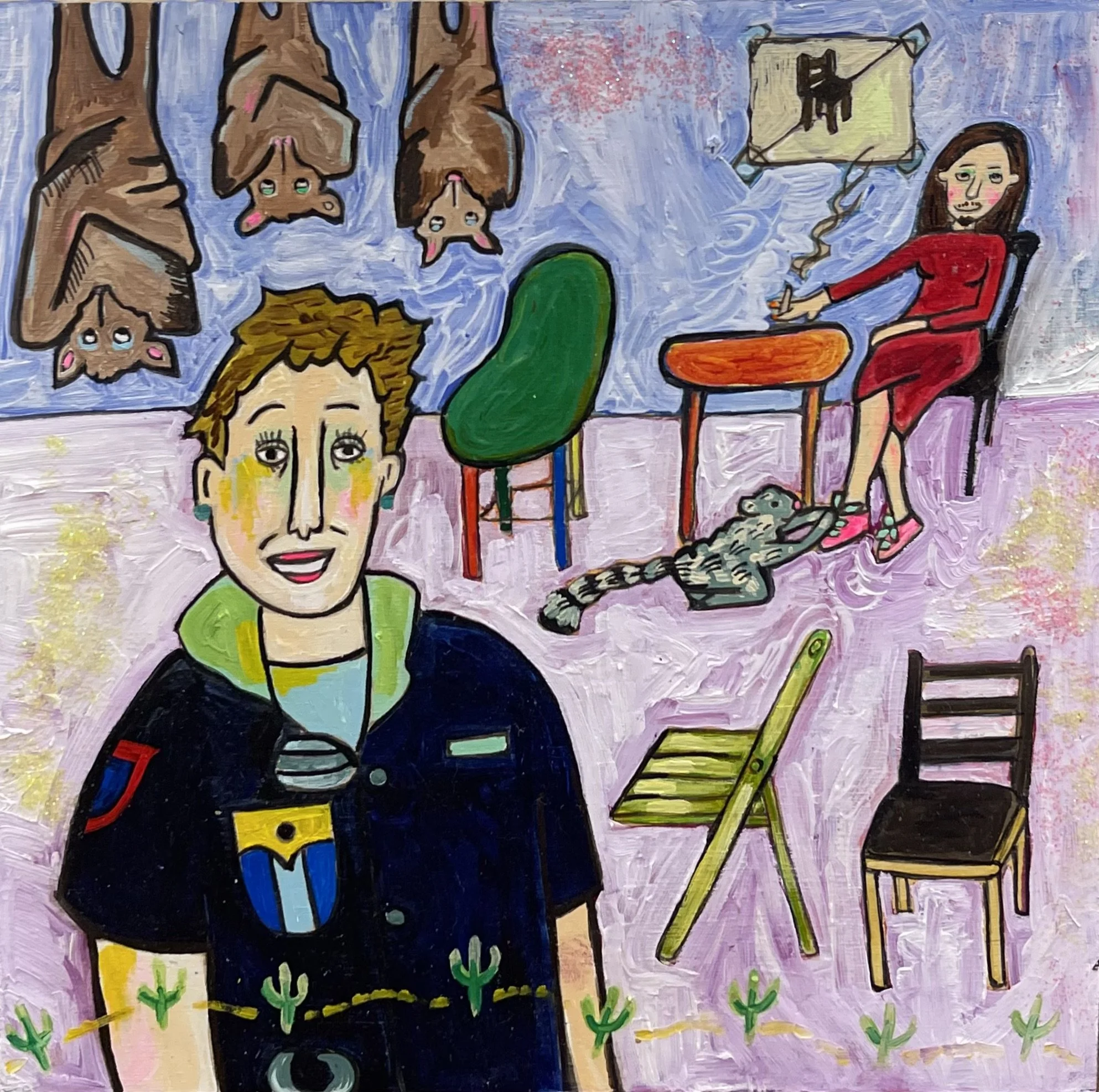 Buddhist teacher Dzongsar Khyentse Rinpoche has said that a knife becomes sharp as the result of "two exhaustions"--the exhaustion of the sharpening stone and the exhaustion of the metal. In the same way, he continues, "enlightenment is the result of the exhaustion of obscurations and the exhaustion of the antidote of obscurations." Liz Scheer sharpens the knife of her 'painting-poems' by rubbing together two disparate narratives (one visual and one verbal) that have respectively 'maxed out' their claims to reality. By pairing small jewel-toned paintings with patches of fiction pulled from a nonexistent ur-text, Scheer's work portrays the unexpected clarity that arises in moments of spiritual depletion. Through its uncanny iconography born from New Age paraphernalia and the culture of New England and the Midwest, Scheer's work portrays a kind of quotidian transcendence suffused with poignancy and humor.